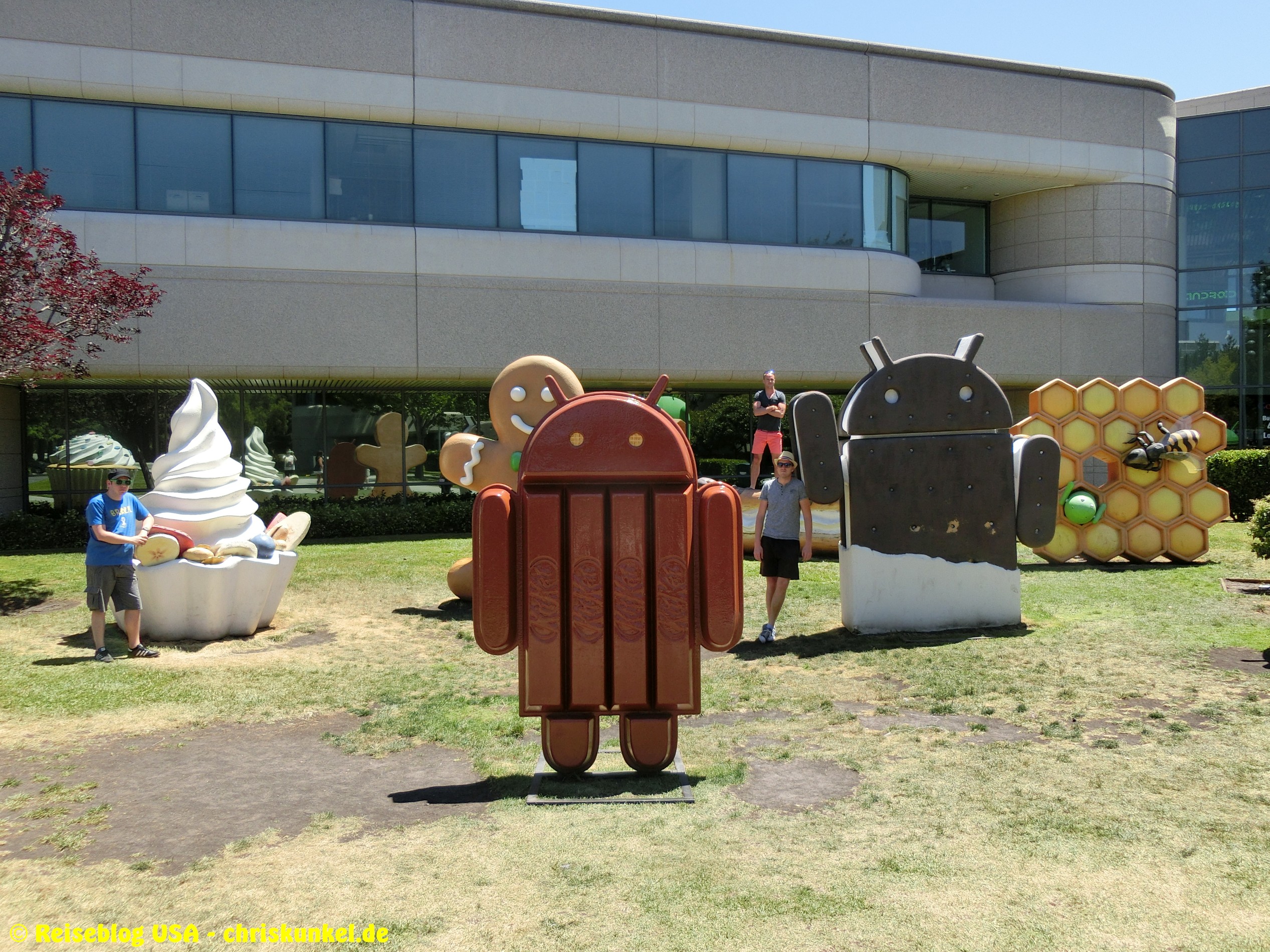Auf besonderen Wunsch zweier Herren verließen wir den Highway No. 1 anschließend, um etwas weiter in Landesinnere zu fahren. Ziel war das berühmte Silicon Valley. Erstes Ziel dort war das Google Hauptquartier. Wir parkten am Googleplex und marschierten selbstsicher über den Campus. Zumindest bis ein Sicherheitsmitarbeiter uns ansprach und fragte, ob wir dort arbeiten würden. Kleidungstechnisch waren wir eher nicht auf Arbeit eingestellt, außerdem war Sonntag und außer uns sonst keiner zu sehen. Trotzdem müssen wir ausreichen fachmännisch gewirkt haben, um als Mitarbeiter durchzugehen. Ehrlicherweise haben wir aber unseren Touristenstatus zugegeben und wurden freundlich des Feldes verwiesen mit dem Hinweis, es doch eine Straße weiter zu probieren. Dort stehen dann auch die bekannten Androidfiguren aller bisher erschienenen (zu der Zeit KitKat) Androidversionen. Nach ein paar Erinnerungsfotos ging es weiter nach San José, wo die Firma Cisco Systems ansässig ist. Auch hier gabs ein paar Bilder vor dem großen Firmenwappen.