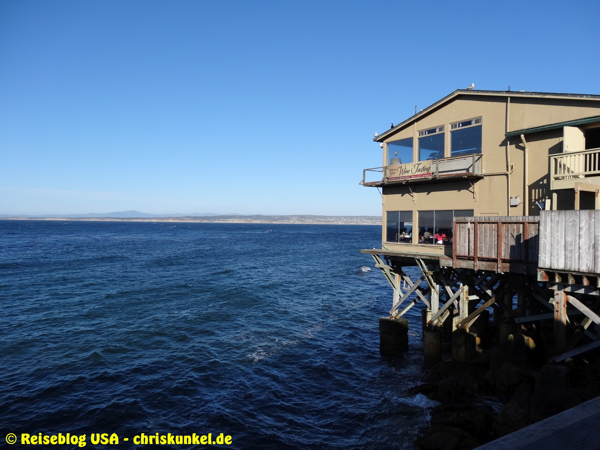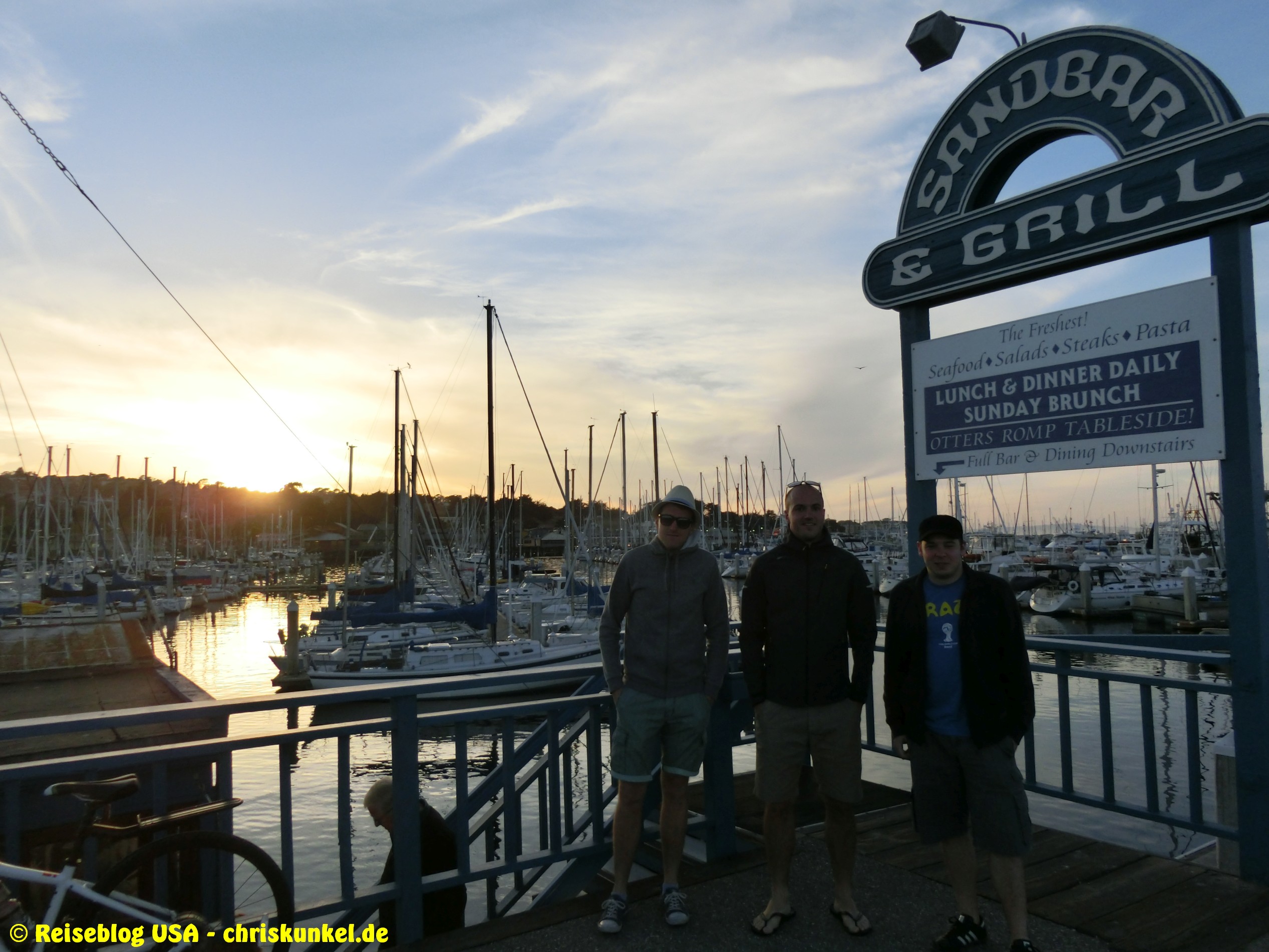 Nach dem kleinen Exkurs ging es wieder weiter auf dem Pacific Coast Highway nach Santa Cruz, wo wir uns in einem Strandcafe einen Drink genehmigten. Anschließend fuhren wir unser letztes Teilstück des Tages ab und kamen nach knapp 50mi in Monterey an. Nach einem kleinen Stadtrundgang kamen wir an einem Anlegesteg an, wo wir zum Abendessen in der „Sandbar & Grill“ einkehrten, einem Restaurant, dass direkt am Steg über dem Wasser liegt und den Eindruck erweckt, man würde auf einem Schiff essen. Service und Essen sind hier ausgezeichnet und sehr zu empfehlen. Anschließend ging es zur Übernachtung ins Super8 Hotel.