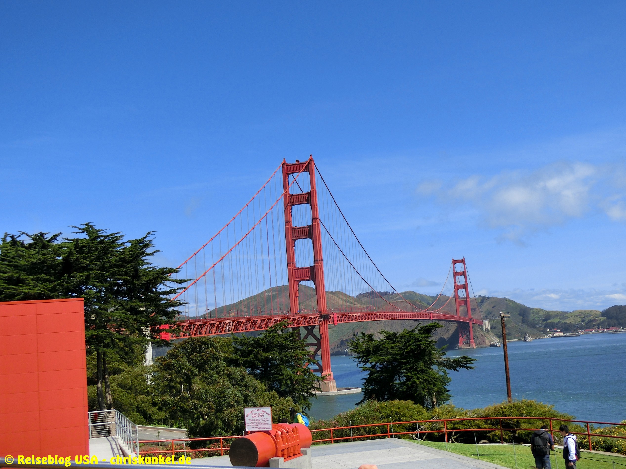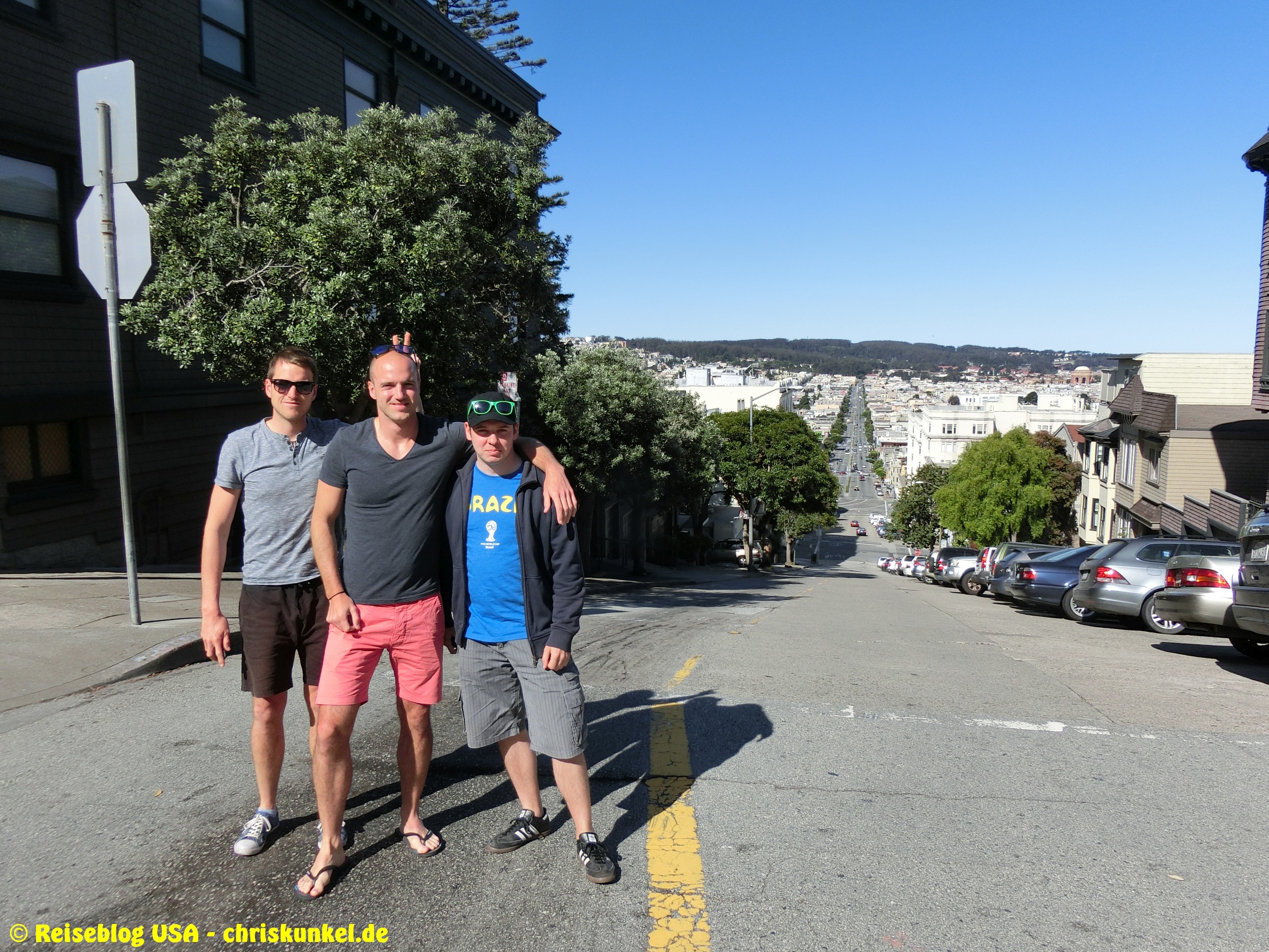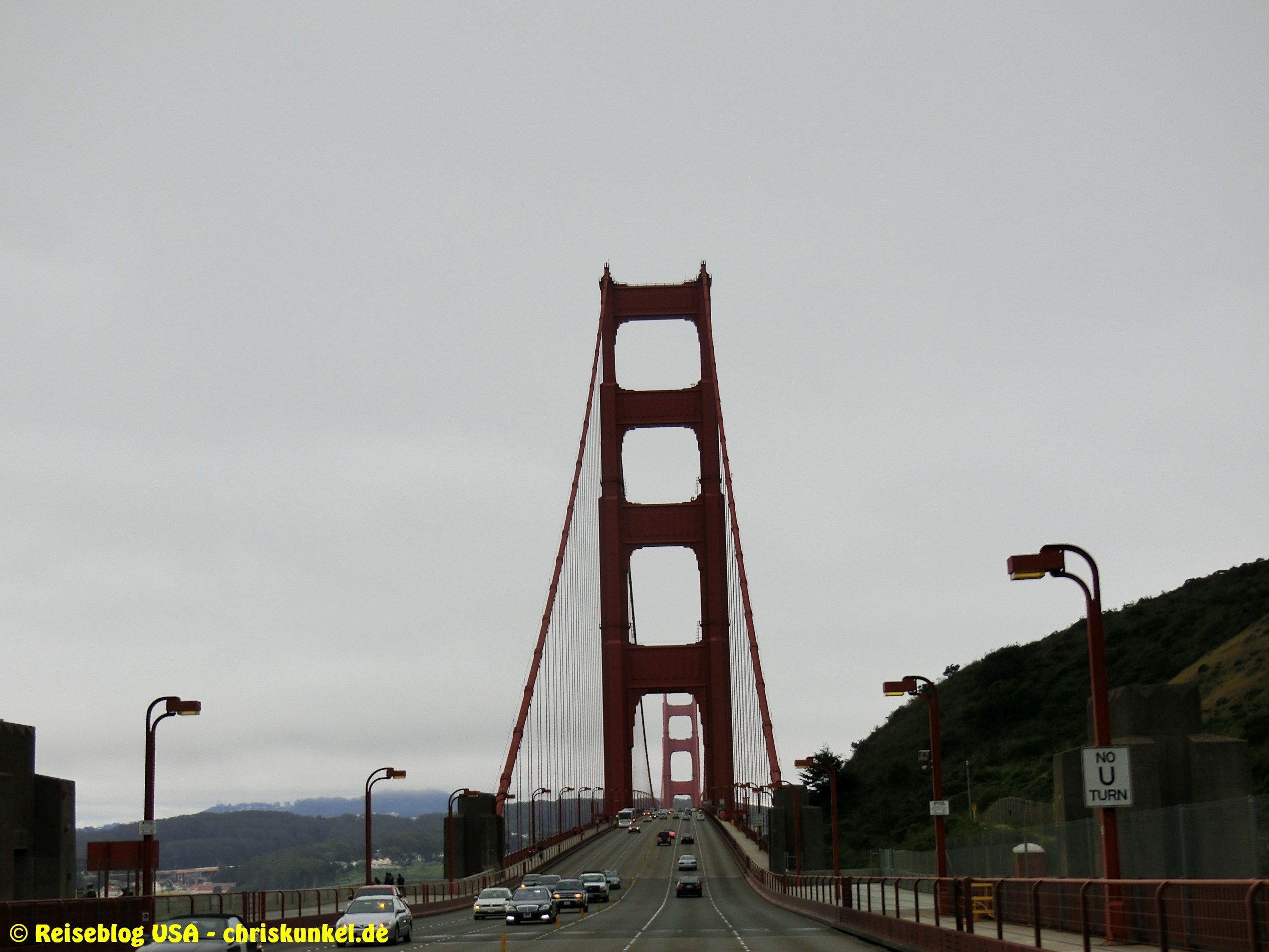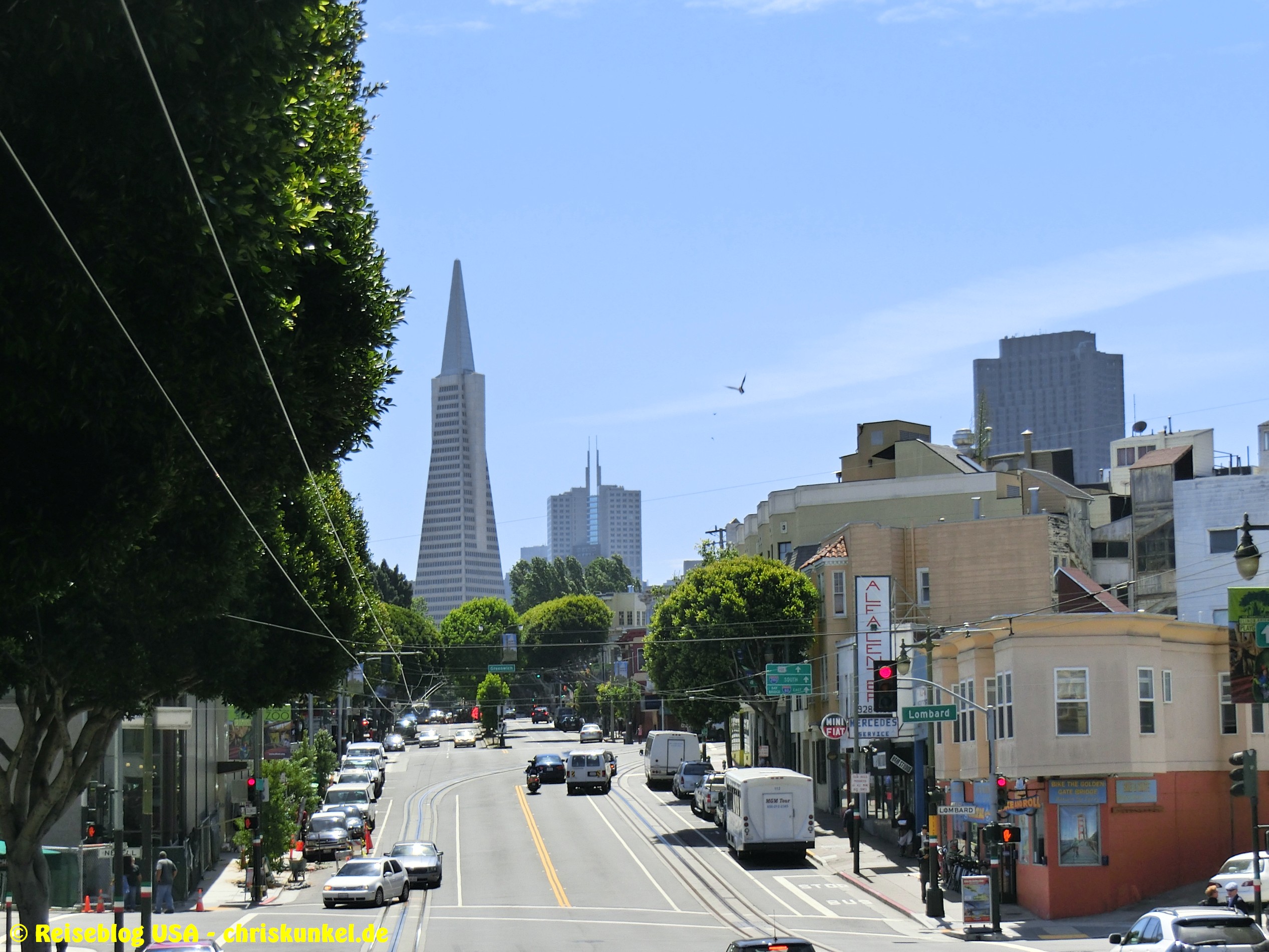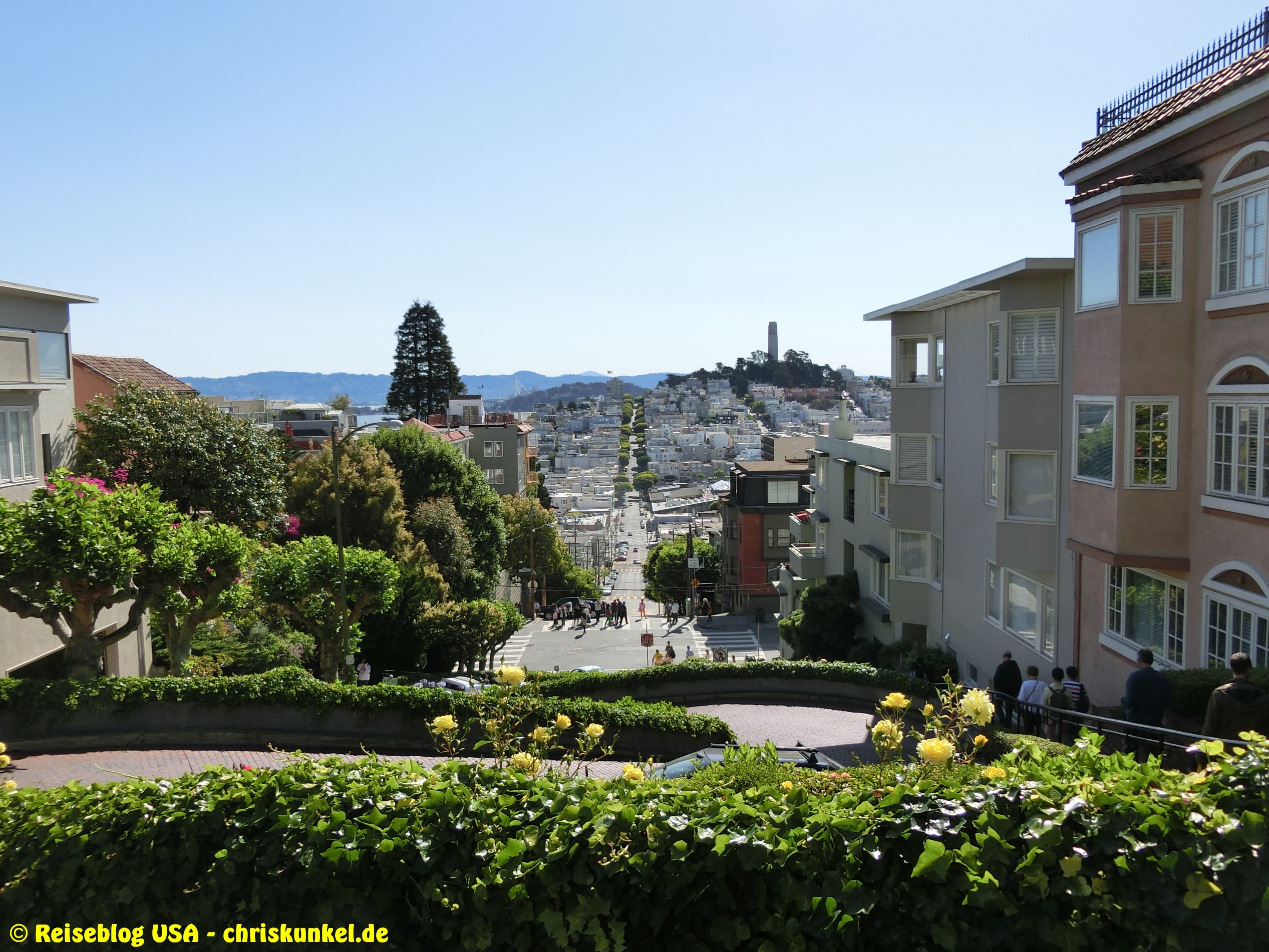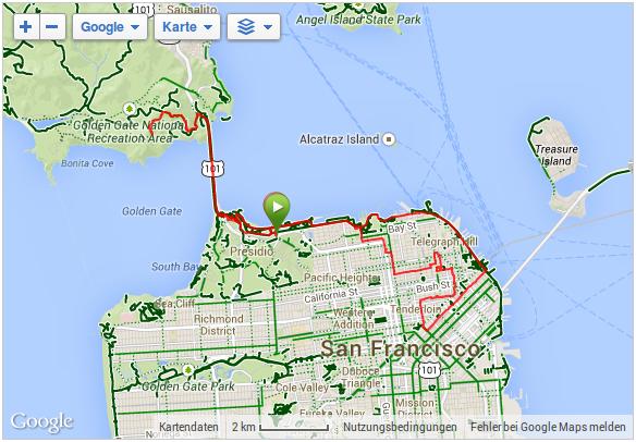 Da wir (natürlich) über die berühmte Golden Gate Bridge in die Stadt hineinfahren wollten, fuhren wir einen kleinen Umweg über die Richmond-San Rafael Brücke, damit wir von Norden aus zur Stadt kamen. Die Richmond-San Rafael Bridge ähnelt äußerlich einer Achterbahn, die beiden Fahrtrichtungen werden auf unterschiedlichen Decks bedient, wir befuhren das untere Deck in westlicher Richtung. So gelangten wir zur Golden Gate Bridge, die wir überquerten und unser Hotel, das Travelodge at the Presidio, ansteuerten. Das Hotel liegt am westlichen Ende der Lombard Street. Das ist die aus vielen Filmen bekannte Straße, die sich am Ostende kurvenreich den Berg hinunterschlängelt.