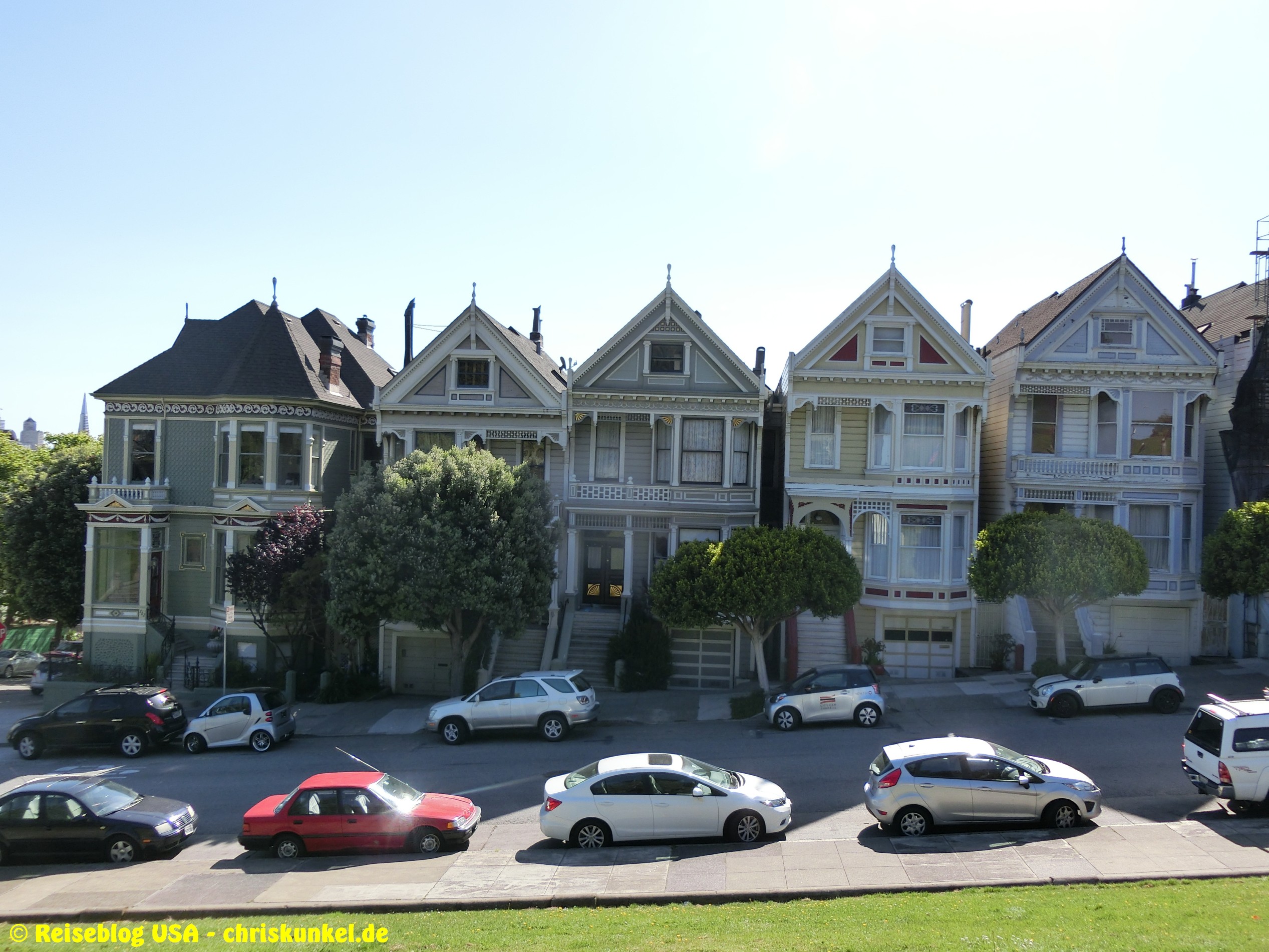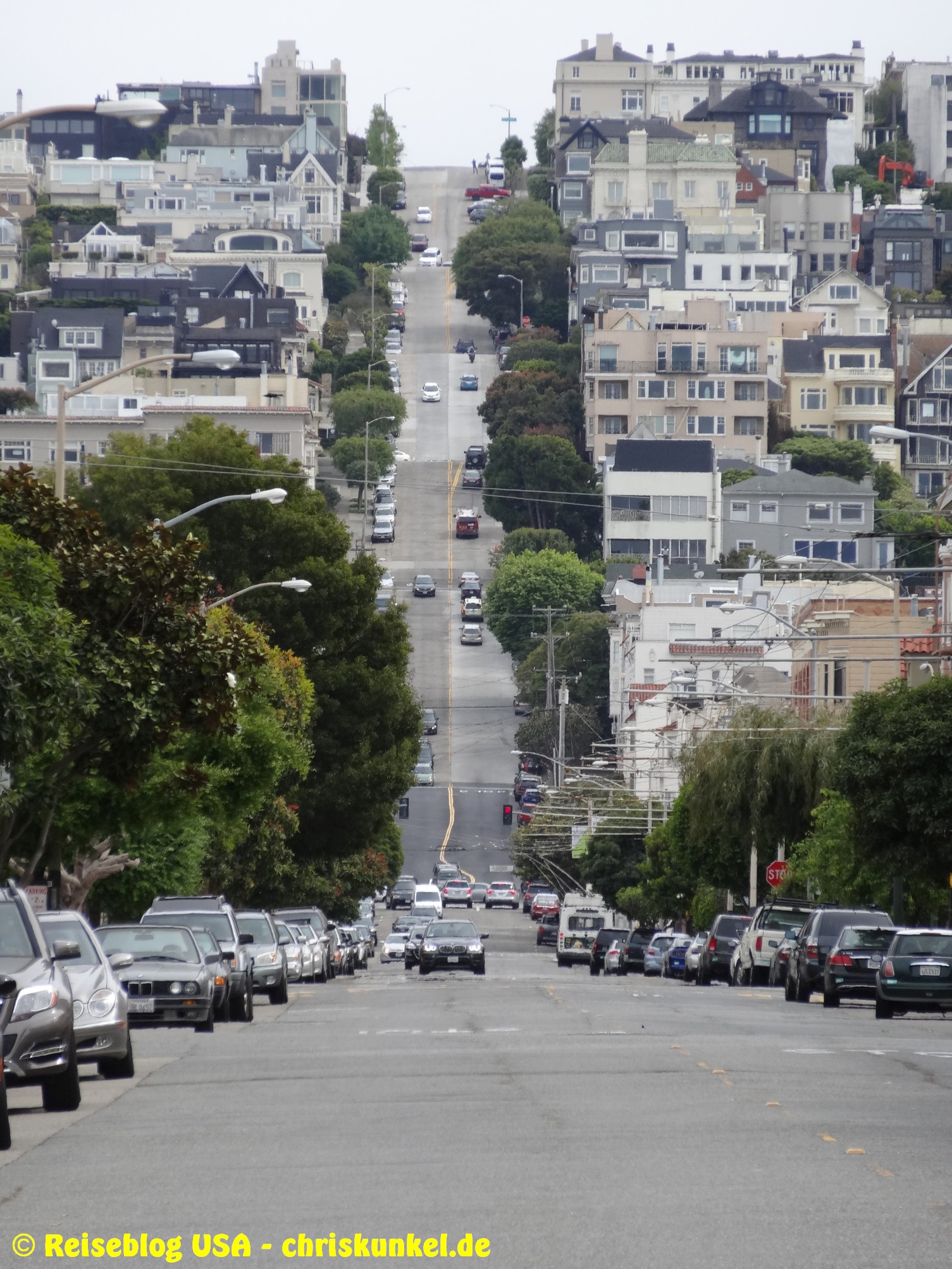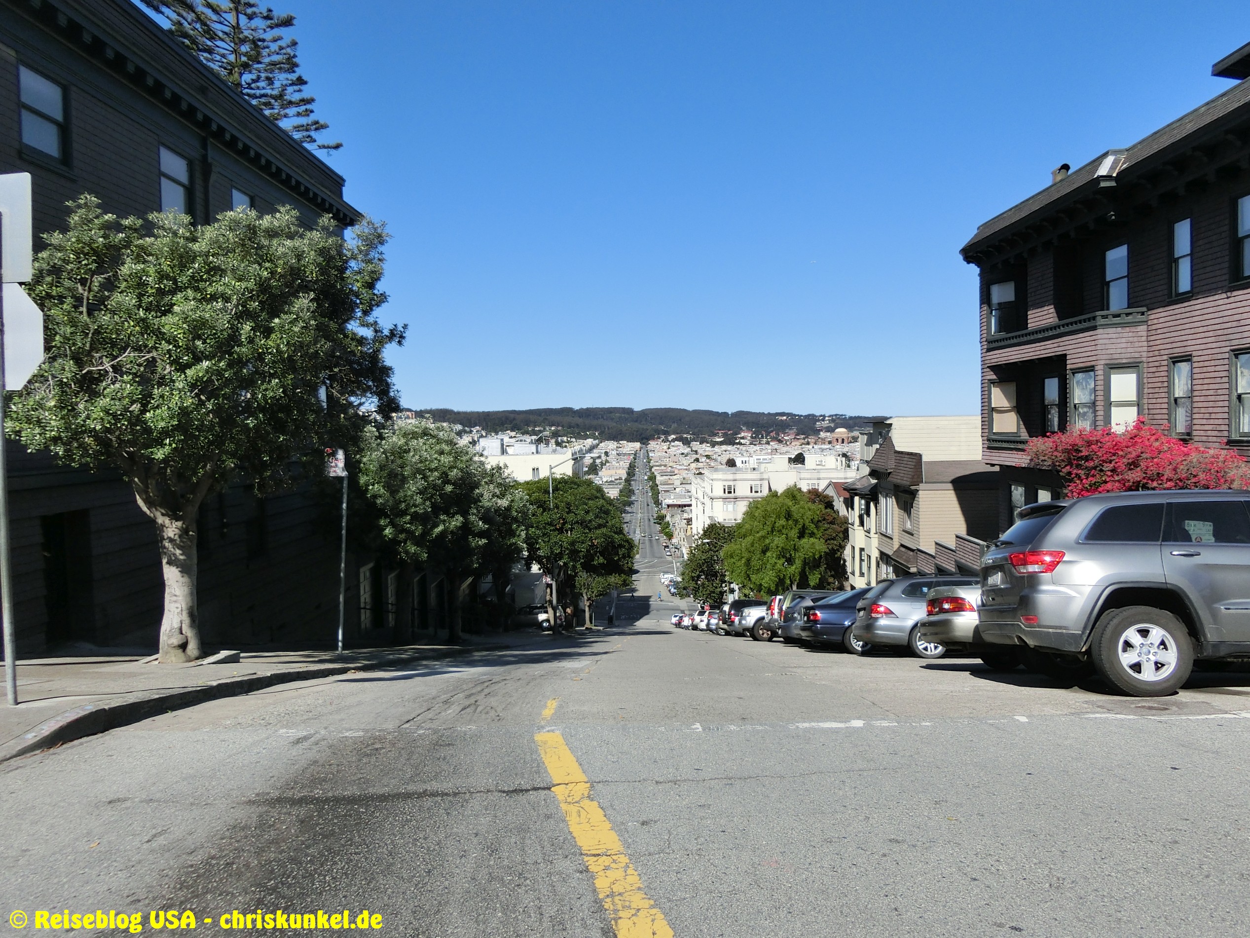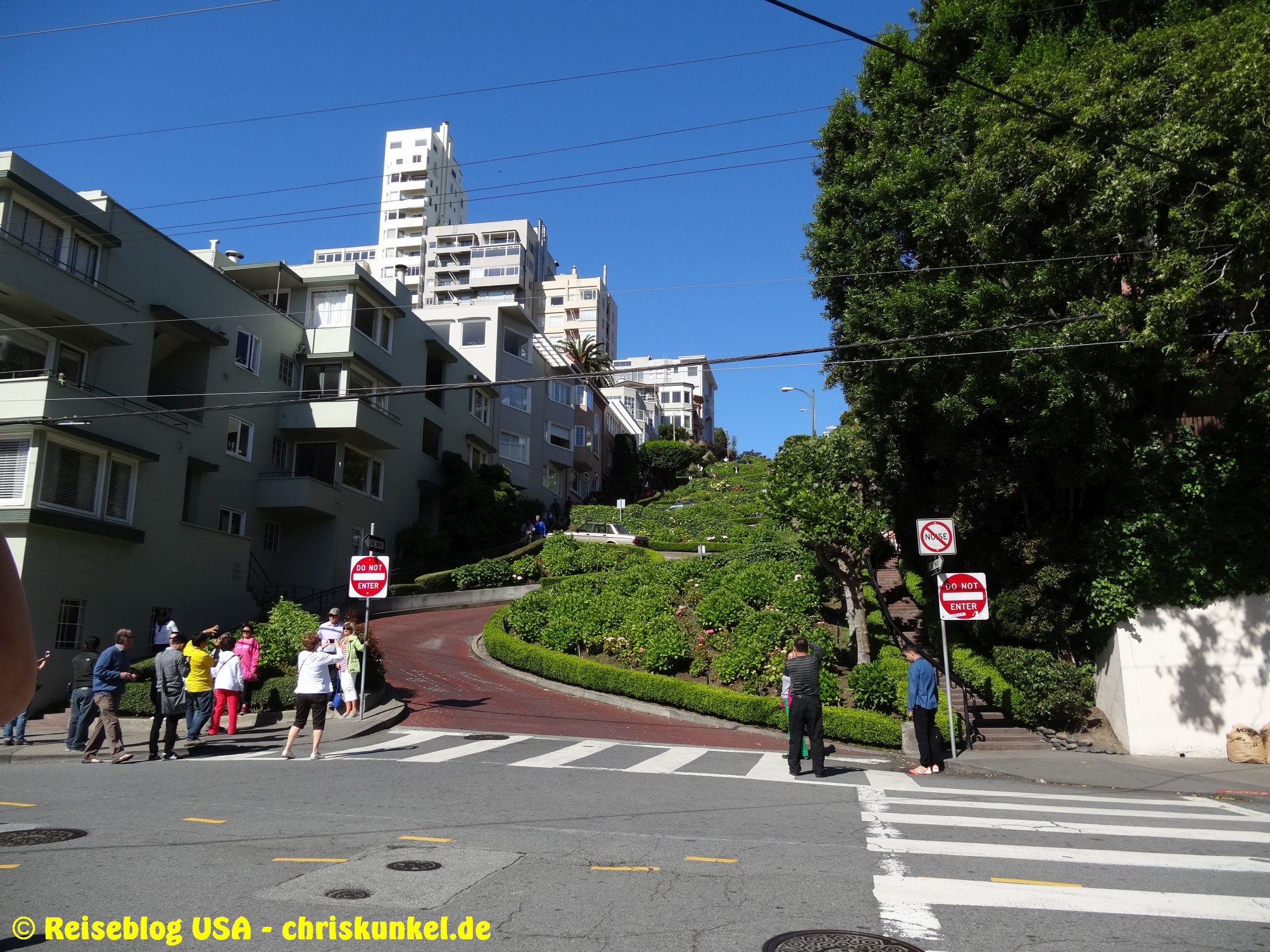 Da wir (natürlich) über die berühmte Golden Gate Bridge in die Stadt hineinfahren wollten, fuhren wir einen kleinen Umweg über die Richmond-San Rafael Brücke, damit wir von Norden aus zur Stadt kamen. Die Richmond-San Rafael Bridge ähnelt äußerlich einer Achterbahn, die beiden Fahrtrichtungen werden auf unterschiedlichen Decks bedient, wir befuhren das untere Deck in westlicher Richtung. So gelangten wir zur Golden Gate Bridge, die wir überquerten und unser Hotel, das Travelodge at the Presidio, ansteuerten. Das Hotel liegt am westlichen Ende der Lombard Street. Das ist die aus vielen Filmen bekannte Straße, die sich am Ostende kurvenreich den Berg hinunterschlängelt.