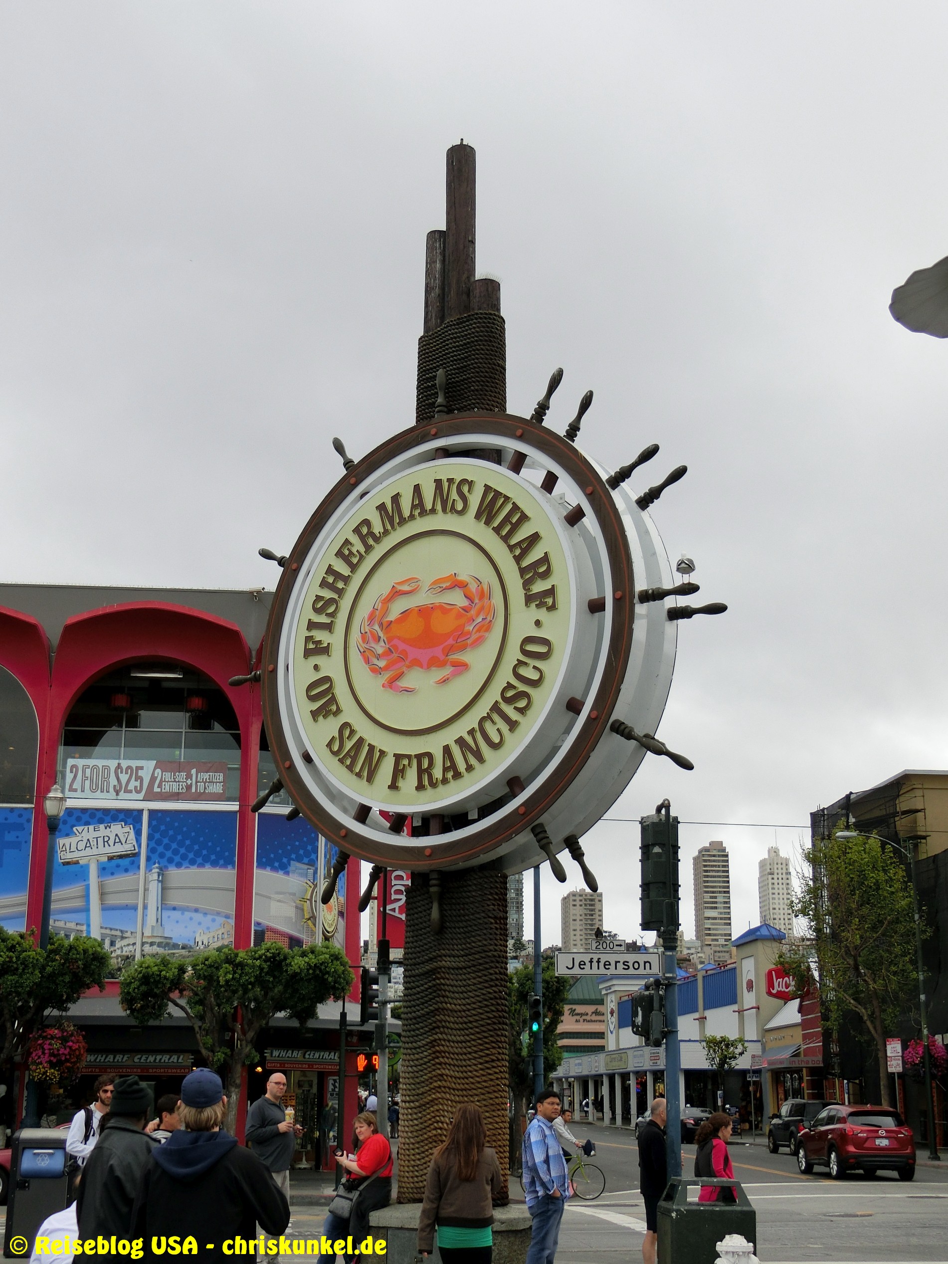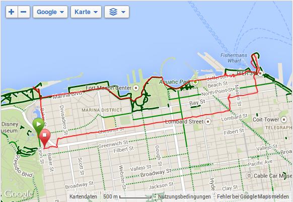 Die Erkundungstour führte vorbei am Palace of Fine Arts zum Golden Gate bzw. zur Bucht von San Francisco. Von dort aus ging es in westlicher Richtung vorbei am Fort Mason Center zum Fisherman’s Wharf, einem beliebten Touristenort mit vielen Verkaufs- und Imbissständen. Außerdem haben sich am Pier 39 auf Anlegestellen Seelöwen niedergelassen. Vom Pier aus ging es dann wieder zurück, wobei wir größtenteils die Chestnut Street in Richtung Westen nahmen, um wieder zurück zum Hotel zu kommen. Insgesamt waren wir gut 3h auf Schusters Rappen unterwegs und haben dabei genau 10km zurückgelegt. Zum Abendessen gingen wir dann zum „Blackwood“, einem thailändischen Restaurant in der Chestnut Street. Scharf bedeutet hier übrigens tatsächlich scharf...