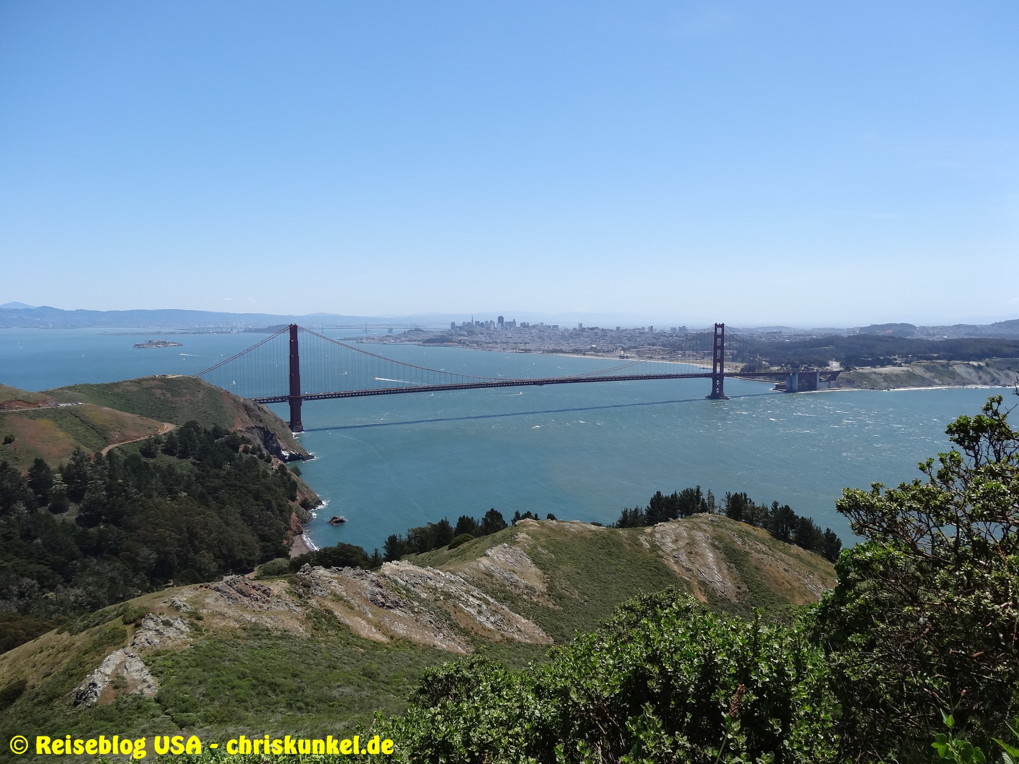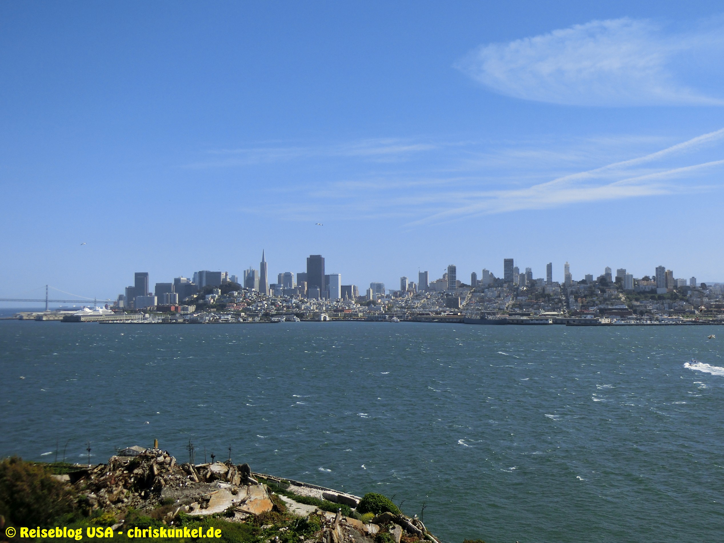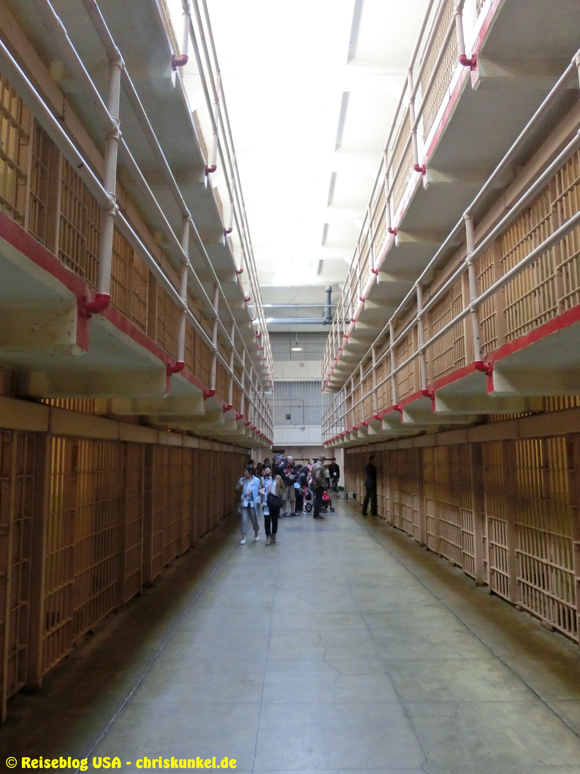 Zur Bustour gehörte auch ein Ausflug nach Alcatraz, der berühmten Gefängnisinsel in der Bay of San Francisco, inkl. einer Führung durch das Gefängnis. Das Hochsicherheitsgefängnis wurde am 1. Januar 1934 eröffnet und aufgrund der hohen Betriebskosten und der hohen Verwitterung durch die rauhe Seeluft am 21. März 1963 geschlossen. Es gab diverse Fluchtversuche, wobei aber keiner der Häftlinge nach der Flucht jemals wieder gesehen wurde. Allgemein wird vermutet, dass es niemand geschafft hat. Für die Tour durch das Gefängnis bekommt jeder Besucher ein Headset, dass durch die Anlage führt und entsprechend die Geschichte, bekannte Häftlinge, Fluchtversuche und weitere Hintergrundinformationen preisgibt. Zur Insel gelangt man mit einem Fährdienst direkt von San Francisco aus.