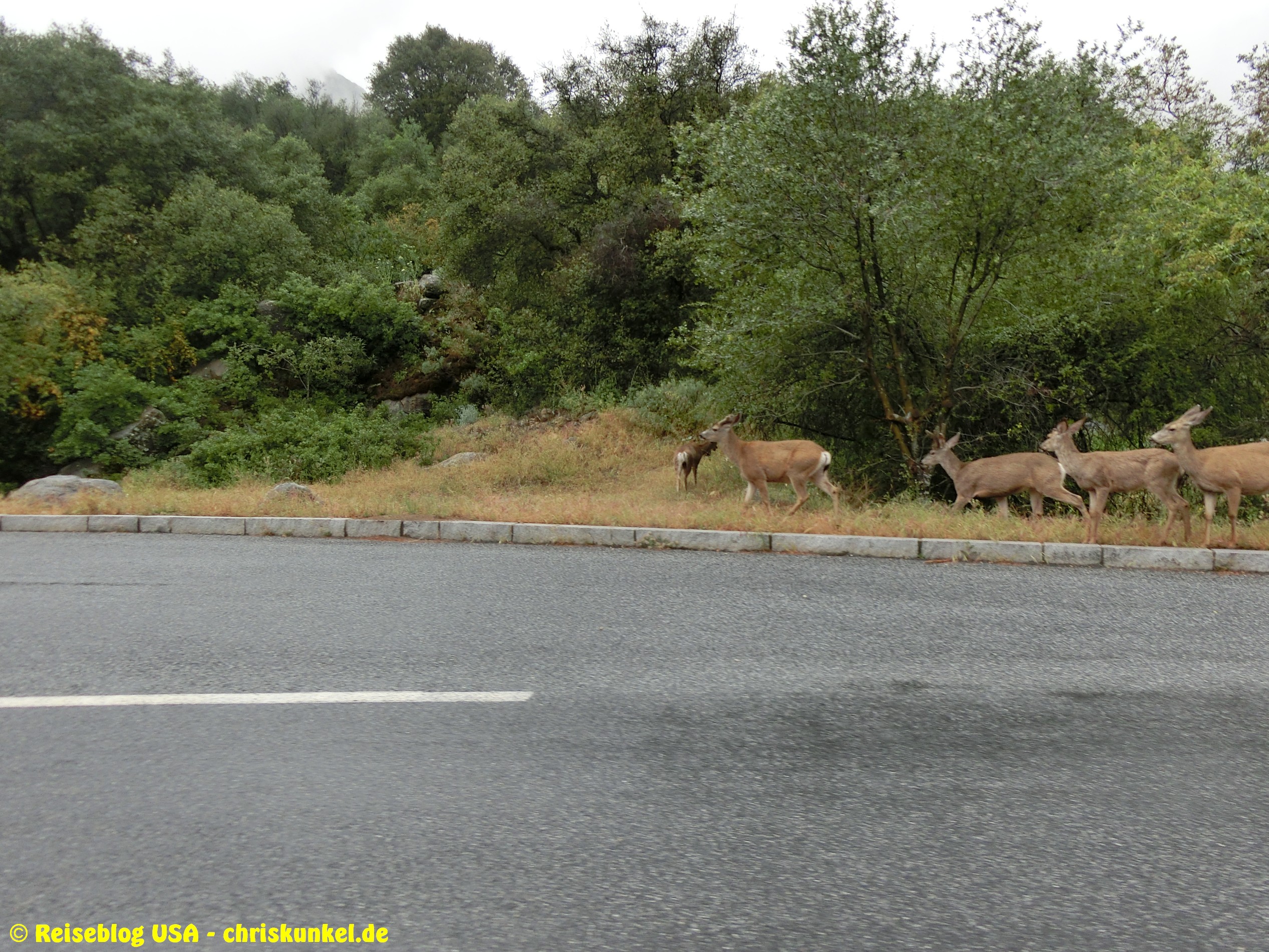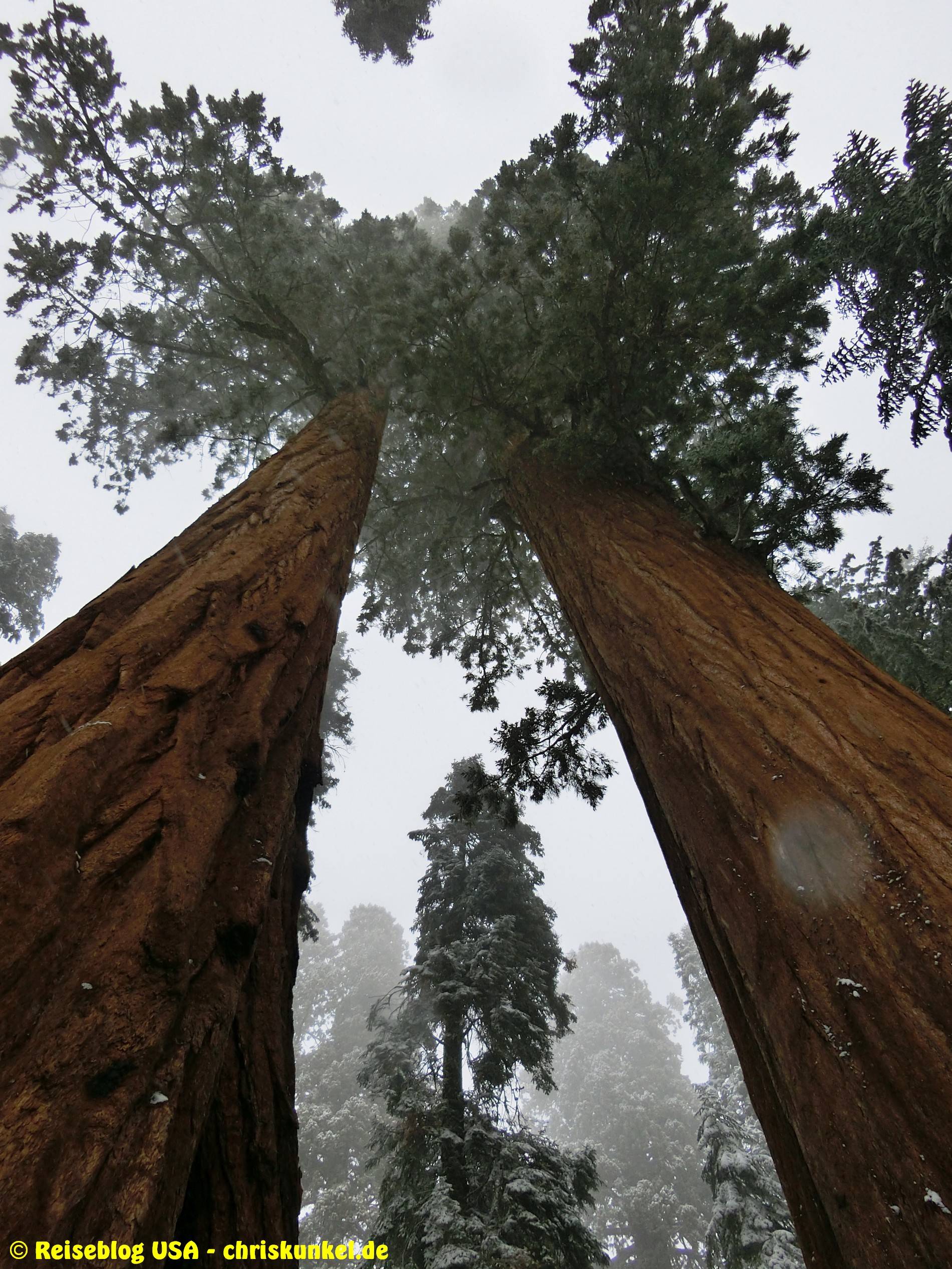 Von Bakersfield aus ging die Reise weiter in Richtung Nordosten. Das sonnige Wetter wurde schlechter, je näher wir dem Sequoia Nationalpark kamen und je höher wir die Sierra Nevada hochfuhren. Letztendlich hat es kurz vor dem Park sogar geschneit.