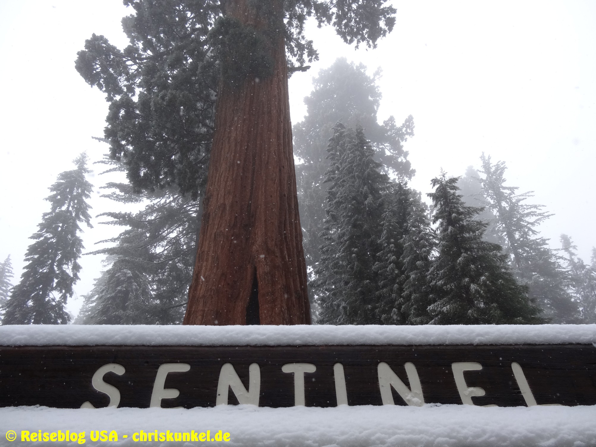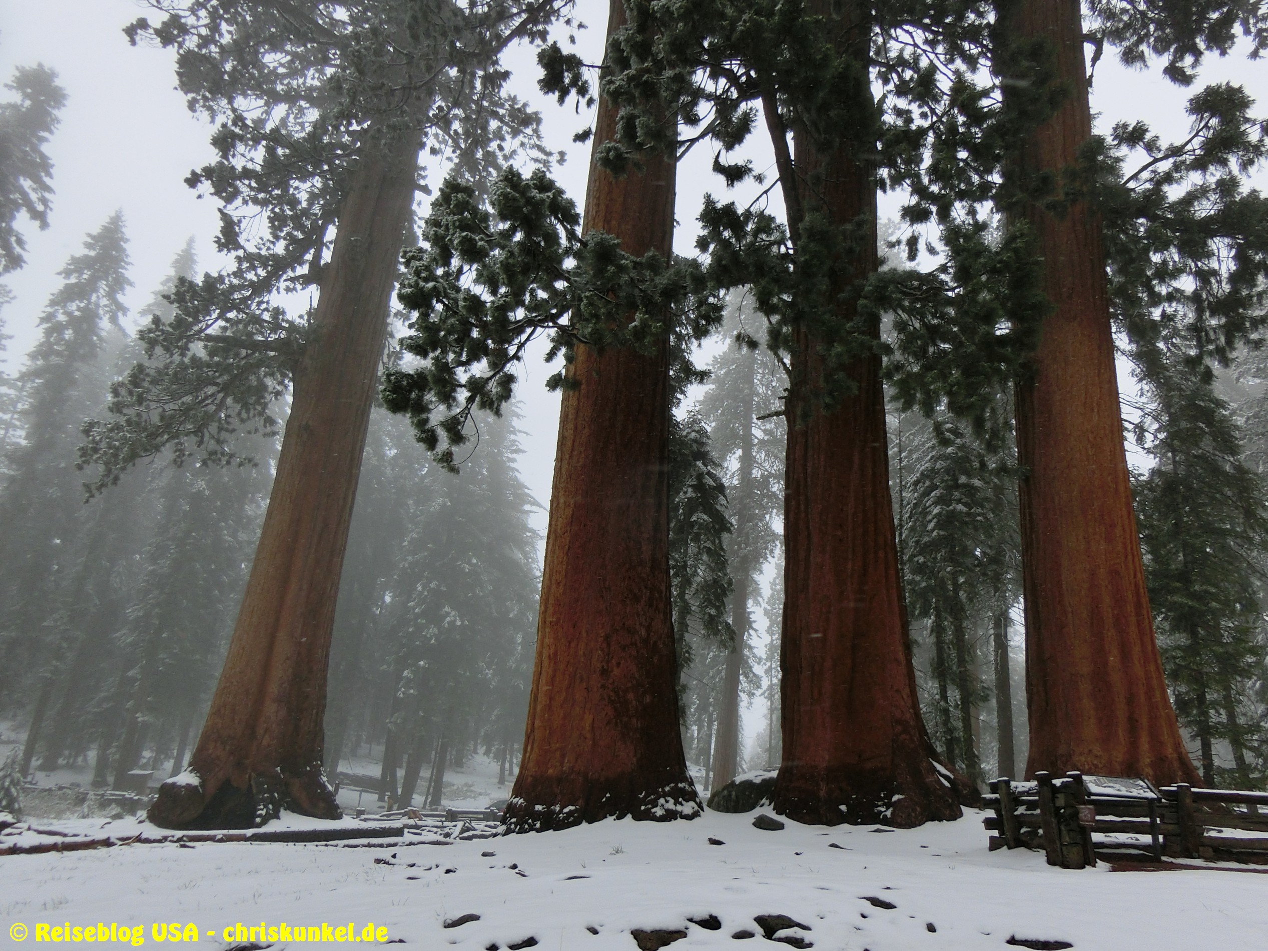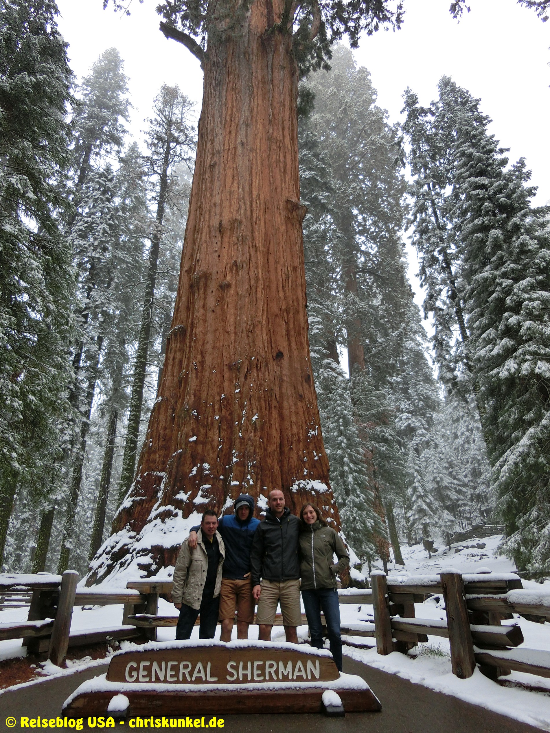 So ging es dann im kalifornischen Schneetreiben den Generals Highway entlang. Der Sequoia Nationalpark ist v.a. für die Riesenmammutbäume bekannt, denen er auch seinen Namen verdankt. U.a. steht hier mit dem General Sherman Tree der größte lebende Baum der Erde. Hier zählt allerdings nicht die Höhe oder Dicke (denn es gibt sowohl höhere als auch dickere Bäume als den General Sherman), sondern das Volumen. Da das Wetter in Bakersfield noch so gut war, trug die Hälfte der Mannschaft noch kurze Hose und T-Shirt. Es waren übrigens die gleichen beiden, die am Vortag mit Sportprogramm und dem Coyoten geprahlt haben 😉. So kam es, dass der knapp 2km lange Fußweg vom Parkplatz zum General Sherman Tree hin und zurück im Laufschritt zurückgelegt wurde. Auf einer Höhe von ca. 2000m für uns Flachländer doppelt anstrengend.