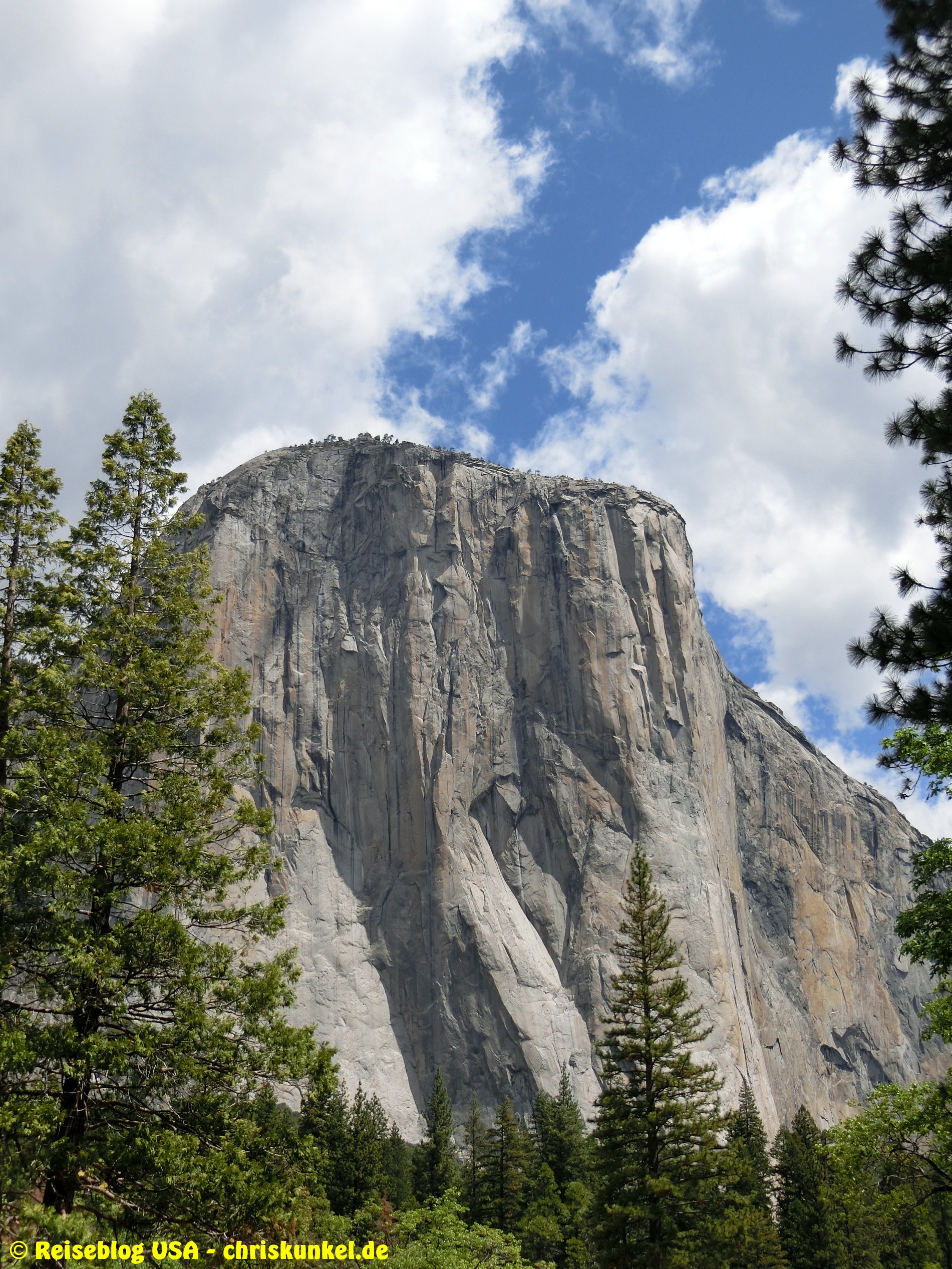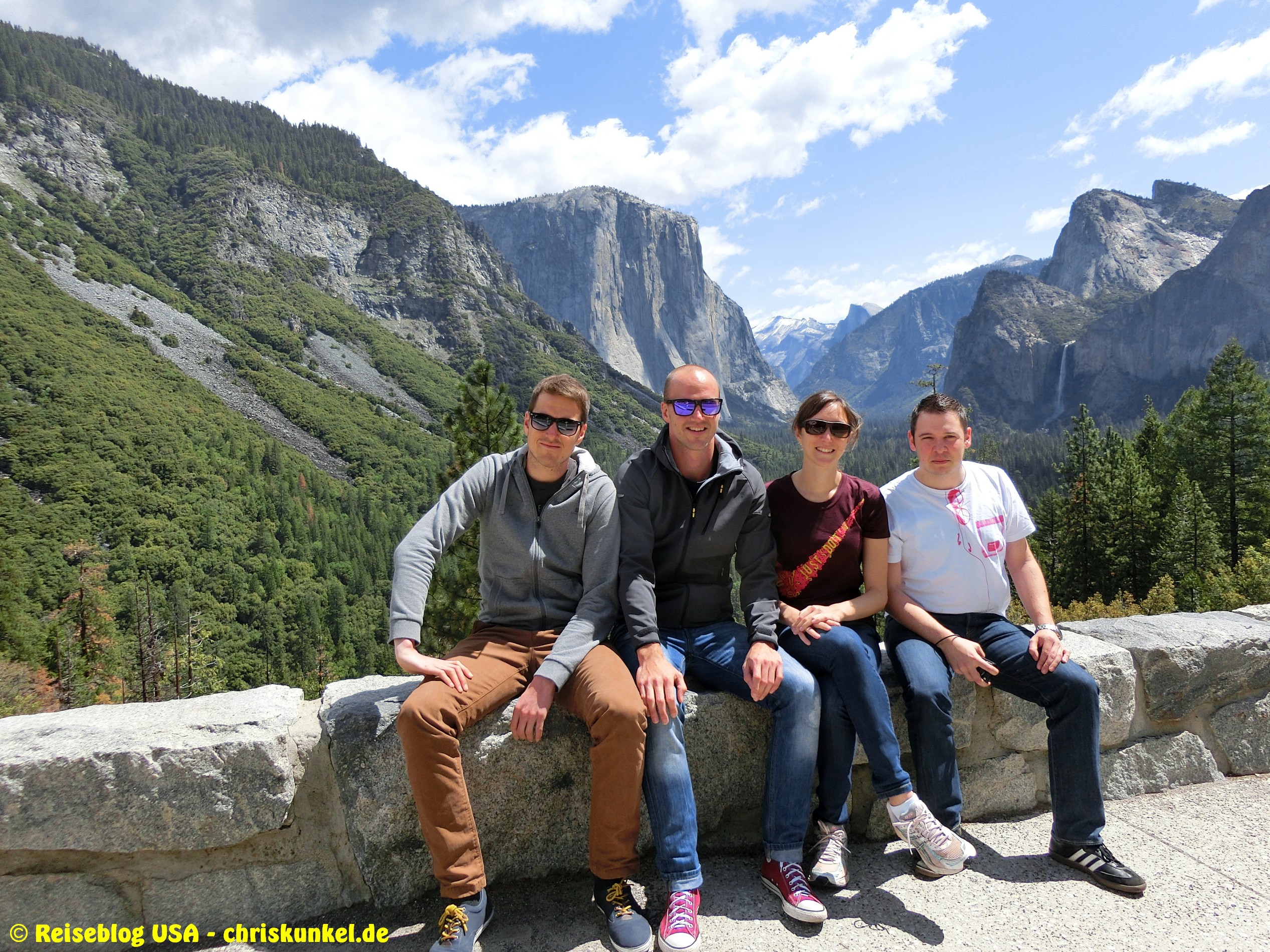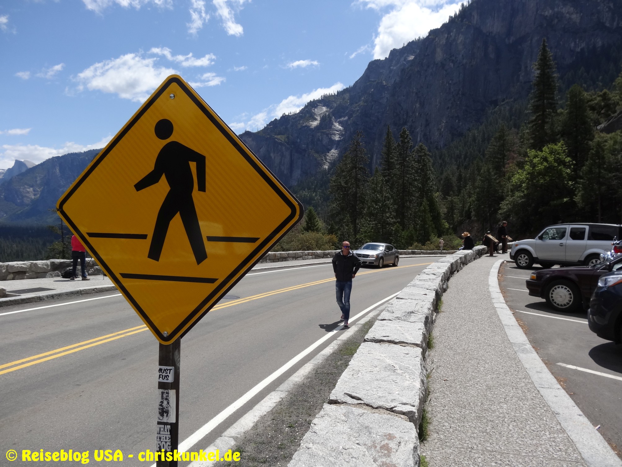 Nach kurzer Einkaufstour im Supermarkt ging es dann in Richtung Park. Von Oakhurst sind es nur ein paar Meilen bis zum Eingang. Innerhalb des Parks sind die Strecken aber wieder endlos. So kamen wir nach einiger Zeit am ersten Aussichtspunkt an, nämlich an Tunnel View. Dieser Aussichtspunkt erscheint nach einer Fahrt durch einen ca. 1,2km langen Tunnel wie aus dem Nichts und bietet einen beeindruckenden Ausblick in das Yosemitetal. Linker Hand erhebt sich der El Capitan, zentral liegt der Half Dome und rechter Hand ist der Bridalveil Fall zu sehen. Zu ihren Füßen breitet sich grüner Wald aus – ein beeindruckende Panorama.